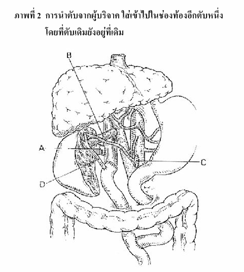 1.2 Heterotopic liver transplantation หรือ auxilliary homotransplantation เป็นการนำตับจากผู้บริจาค ใส่เข้าไปในช่องท้องอีกตับหนึ่ง โดยที่ตับเดิมยังอยู่ที่เดิม มักใช้ในผู้ป่วยรายที่คิดว่าตับที่เสียไปนั้นมีโอกาสที่จะฟื้นคืนกลับมาในภายหลัง ปัจจุบันไม่นิยมทำกัน (ดังภาพที่ 2)