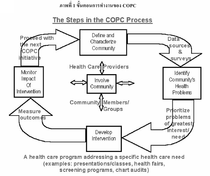 การดำเนินการทั้ง 4 ขั้นตอนนี้ อาจวนเวียนเป็นวงจรบริการที่ต่อเนื่องไปเรื่อยๆ ได้ เนื่องจากทุกชุมชนจะมีปัญหาใหม่เกิดขึ้นเสมอ. COPC สามารถสรุปเป็นแผนภูมิอธิบายขั้นตอนการดำเนินงานได้ดังแผนภูมิที่ 1.2