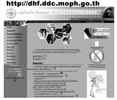 เว็บไซต์แรกเป็นของกลุ่มโรคไข้เลือดออก สำนักโรคติดต่อนำโดยแมลง กรมควบคุมโรค กระทรวงสาธารณสุข ซึ่งมีรายละเอียด สถานการณ์โรค แนวทางการปฏิบัติงานควบคุมโรคไข้เลือดออก การประเมินผลการควบคุมลูกน้ำยุงลาย ดัชนีสำรวจยุง ข้อมูล GIS (Geographic Information Systems) และบทคัดย่อของบทความโรคไข้เลือดออกที่ตีพิมพ์ในวารสารต่างๆ.