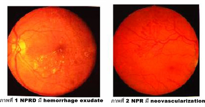 1. ระยะต้น non-proliferation DR (NPDR) มีเฉพาะจุดเลือดออก (dot & blot hemorrhage) และไขมัน (exudates) ใน จอประสาทตา (ภาพที่ 1).