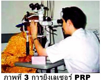 ความถี่ในการตรวจจอประสาทตา กรณีไม่พบภาวะปกติ (no DR) ประมาณ 1 ปี/ครั้ง, เป็น early background diabetic retinopathy (BDR) หรือเรียกว่า non-proliferative diabetic retinopathy คือมีเฉพาะจุดเลือดออกในจอประสาทตาควรตรวจทุก 6 เดือน และกรณีเป็น advanced BDR (มี cotton wool คือ nerve fiber ischemia เห็นเป็นสีขาวขอบเขตไม่ค่อยชัดที่จอประสาทตา) ควรตรวจทุก 3 เดือน,หากเป็น proliferative diabetic retinopathy (PDR) คือมีหลอดเลือดเกิดใหม่ (neovascular) ที่จอประสาทตาควรส่งพบจักษุแพทย์เพื่อให้การรักษาโดยยิงเลเซอร์ PRP (pan-retinal photocoagulation)(ภาพที่ 3)เลย.