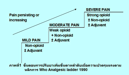 5. ใช้ยาระงับปวดและยาร่วม (co-analgesics) ตามหลักเกณฑ์ของ WHO Analgesic ladder 1990.