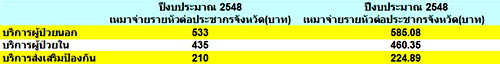 1. งบรายจ่ายรายหัวที่จัดสรรให้จังหวัดเพื่อการดูแลรักษาทั่วไปสำหรับผู้ป่วยนอก ผู้ป่วยใน และสร้างเสริมสุขภาพ เพิ่มขึ้นจากปี พ.ศ. 2548 อยู่แล้วตามตาราง