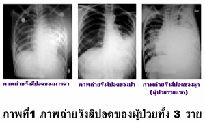 ผู้ป่วยรายแรก เป็นเด็กหญิงอายุ 11 ปี อาศัยอยู่กับป้า เริ่มมีไข้ ไอ เจ็บคอ เมื่อวันที่ 2 กันยายน พ.ศ. 2547 ได้เข้ารับการรักษาในโรงพยาบาลวันที่ 7 กันยายน พ.ศ. 2547 ด้วยอุณหภูมิร่างกาย 38.5 ๐ซ. หายใจลำบาก ผลตรวจทางห้องปฏิบัติการพบ leucopenia และ thrombocytopenia ภาพถ่ายรังสีทรวงอก (ดังภาพที่ 1) พบ infiltration ที่ปอดกลีบขวาล่าง. ต่อมาอาการป่วยรุนแรงขึ้นมี progressive respiratory distress, hypoxemia และช็อกจึงได้ส่งต่อไปรักษาที่โรงพยาบาลจังหวัดในวันถัดมาและเสียชีวิตโดยได้รับการวินิจฉัยเป็นปอดอักเสบและ R/O Dengue Shock Syndrome.