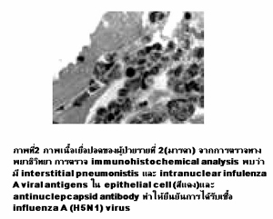 ผู้ป่วยรายที่ 2 เป็นมารดาของผู้ป่วยรายแรกอายุ 26 ปี อาศัยอยู่คนละจังหวัดกับผู้ป่วยรายแรกวันที่ 7 และ 8 กันยายน พ.ศ. 2547 มารดาได้มาเฝ้าดูแลบุตรสาวที่ป่วยในโรงพยาบาลอย่างใกล้ชิด. 3 วันต่อมาเริ่มมีไข้ ปวดศีรษะ วันที่ 17 กันยายน พ.ศ. 2547 ได้เข้ารับการรักษาในโรงพยาบาลใกล้บ้านด้วยไข้ หายใจเหนื่อยหอบมาก ผลตรวจทางห้องปฏิบัติการพบ leucopenia และ thrombocytopenia ภาพถ่ายรังสีทรวงอกพบ interstitial infiltration ในปอดทั้ง 2 ข้าง (ภาพที่ 2) ได้รับการวินิจฉัยเป็นปอดบวมร่วมกับ progressive respiratory failure ต่อมาเสียชีวิตวันที่ 20 กันยายน พ.ศ. 2547.