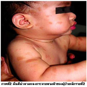 หญิงไทย อายุ 16 เดือน ภูมิลำเนาจังหวัดปทุมธานี มารดา๊ังเกตพบผื่นสีน้ำตาลแดงกระจายตามตัว (ภาพที่ 2) ตั้งแต่อายุ 4 เดือน จำนวนเพิ่มขึ้นช้าๆ เวลาอาบน้ำหรือเช็ดถูตัวหรือในช่วงอากาศร้อนผื่นดังกล่าวจะนูนแดงขึ้นและเด็กจะคันและเกา ผื่นนูนคันจะเป็นอยู่ช่วงเวลาหนึ่งแล้วแบนราบลงผู้้ป่วยไม่มีอาการท้องเสียผิดปกติ.