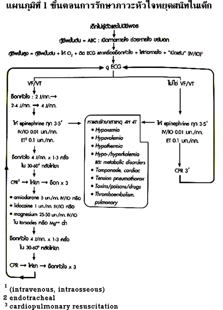 เด็กที่เกิดภาวะหัวใจหยุด มักจะพบว่าเป็นภาวะหัวใจหยุดสนิท (asystole) หรือหัวใจเต้นช้าที่มักมี QRS กว้าง (wide QRS brady-arrhythmia).