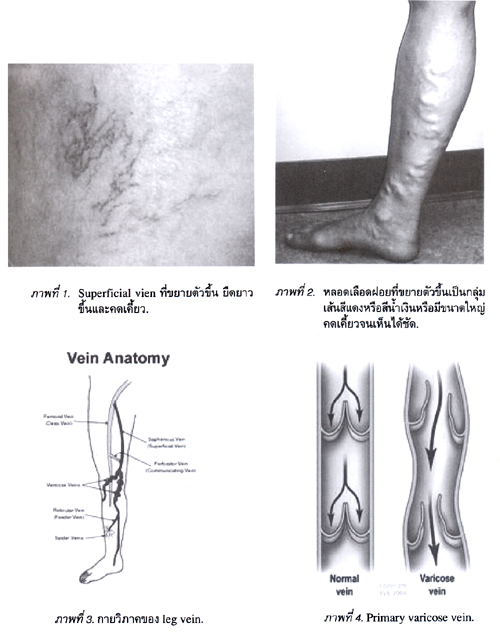 1. Primary varicose vein ซึ่งเกิดจาก valve ภายใน superficial vein เสีย (ภาพที่ 4) โดยส่วนใหญ่มักเกิดที่ sapheno-femoral junction ทำให้เกิดภาวะ venous hypertension ภายใน superficial vein ซึ่งผลก็คือ หลอดเลือดดำมีการขยายตัวใหญ่ขึ้น และ valve อื่นๆในระดับต่ำลงมาก็จะเสียตามไปด้วยเป็นวงจร.