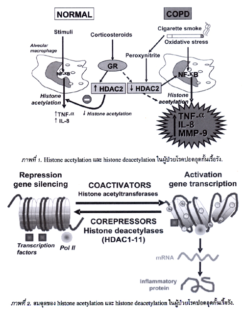 ในระบบสมดุลของร่างกายจะมีทั้งกระบวนการยับยั้งและส่งเสริมการอักเสบสำหรับผู้ป่วยโรค COPD จะมีกระบวนการส่งเสริมการอักเสบมากกว่าคนปกติ ซึ่งก่อให้เกิด oxidative stress กระตุ้น alveolar macrophages ให้หลั่ง nuclear factor-B (NF-B) และเร่งกระบวนการ histone acetylation ซึ่งต่อมาจะกระตุ้น inflammatory genes ให้สร้างโปรตีน ที่เกี่ยวข้อง ได้แก่ tumor necrosis factor alpha (TNF-a), granulocyte-macrophage colony-stimulating factor (GM-CSF) และ interleukin (IL)-8 ทำให้เกิดพยาธิสภาพที่ปอด (ภาพที่ 1 และ 2).