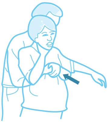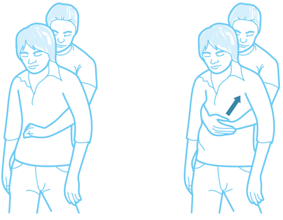 - อัดหมัดเข้าท้องซ้ำๆ กัน หลายๆ ครั้ง จนกว่าสิ่งแปลกปลอมจะหลุดออกมา หรือจนกว่าผู้ป่วยจะหมดสติ.