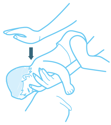 - ถ้าไม่ได้ผล จับทารกนอนหงายบนแขนให้ศีรษะตํ่า แล้วใช้นิ้วชี้กับ นิ้วกลางวางบนกระดูกหน้าอกเหนือกระดูกลิ้นปี่ แล้วกดอกลง (สักครึ่งถึง 1 นิ้ว) เร็วๆ 5 ครั้ง (ดังรูป จ.).