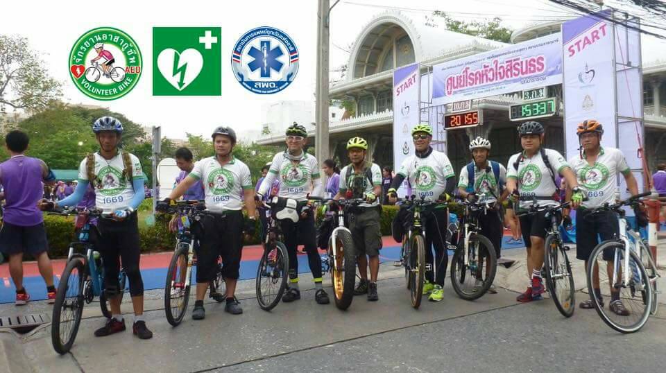 “ตอนนี้เรามีเครื่อง AED ชนิดกระเป๋าหิ้ว ติดตั้งกับจักรยานได้ถึง ๔ เครื่อง ต้องขอบคุณท่านผู้มีใจศรัทธาที่ช่วยบริจาคอุปกรณ์ดังกล่าว ซึ่งราคาเครื่องละหลายหมื่นบาทให้ครับ”