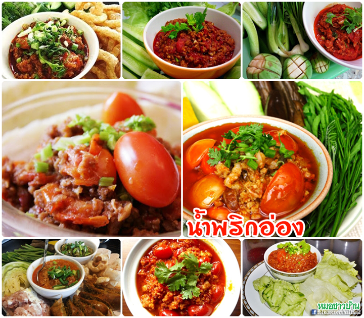 น้ำพริกพื้นบ้านล้านนาที่รู้จักกันดีพอๆ กับน้ำพริกหนุ่ม ซึ่งน้ำพริกอ่องมีสีสันน่ารับประทาน สีส้มแดงจากมะเขือเทศและพริกแห้ง เคี่ยวจนเป็นน้ำขลุกขลิก มีน้ำมันลอยหน้าเล็กน้อย ตัวน้ำพริกมีรสชาติเปรี้ยว เค็ม เผ็ดเล็กน้อย และมีรสหวานตาม กินกับผักสดพื้นบ้าน ผักสด ผักต้ม แคบหมูตามชอบ ทั้งนี้มะเขือเทศซึ่งเป็นส่วนผสมสำคัญของน้ำพริก มีสารเบต้าแคโรทีนและไลโคปีน ซึ่งเป็นประโยชน์ต่อร่างกายช่วยกำจัดสารพิษ ต่อต้านอนุมูลอิสระ ช่วยป้องกันหลอดเลือดอุดตัน ลดไขมันในเส้นเลือด ลดอัตราเสี่ยงโรคมะเร็ง ขณะที่พริกช่วยบำรุงร่างกาย เพิ่มการเผาผลาญร่างกาย ลดอาการไขข้ออักเสบ ลดความเสี่ยงการเกิดโรคมะเร็งปอดและช่องปาก เป็นต้น