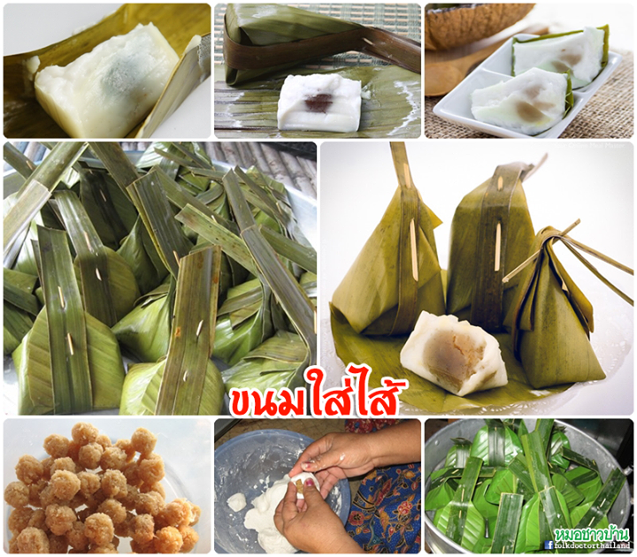 เรียกอีกชื่อว่า "ขนมสอดไส้" ขนมไทยๆ ที่ยังพอหากินได้ไม่ยากนัก ห่อด้วยใบตองแล้วมีเตี่ยวคาด (เตี่ยวคือทางมะพร้าว) ห่อเป็นรูปทรงสูง ขนมใส่ไส้มีกลิ่นหอมและหวานจากตัวไส้ รสหวานมันด้วยกะทิสด แต่ขนมใส่ไส้ที่ครบรสทั้งหอมและหวานมันหาได้ยากเต็มทน ด้วยต้นทุนสำคัญคือมะพร้าวมีราคาแพงนั่นเอง มะพร้าวที่ใช้เป็นมะพร้าวทึนทึกไม่อ่อนไม่แก่ หน้าขนมใส่ใส้ที่ดีจะมีความเนียนนุ่ม เป็นเนื้อเดียวกัน