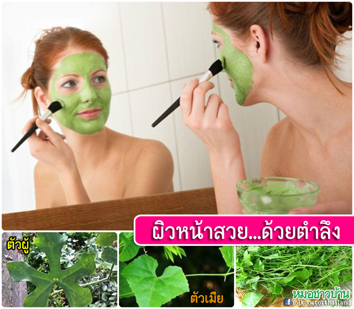 - วิธีที่ 2 ใช้ใบตำลึงประมาณ 1 กำมือ น้ำสะอาด 2-3 ช้อนโต๊ะ ปั่นเข้าด้วยกันจนเป็นครีม นำข้าวสาร (ถ้าเป็นข้าวกล้องได้ก็ดี) 2 ช้อนชาไปแช่น้ำจนนิ่มนำไปบดให้ละเอียด แล้วผสมกับครีมตำลึง นำไปพอกหน้าทิ้งไว้จนแห้งจึงล้างออก จะช่วยกำจัดพิษบนใบหน้า แก้สิว ทำให้ผิวหน้าชุ่มชื่น หรือหากไม่สะดวกในการเตรียมข้าวสาร จะใช้ครีมตำลึงอย่างเดียวก็ได้