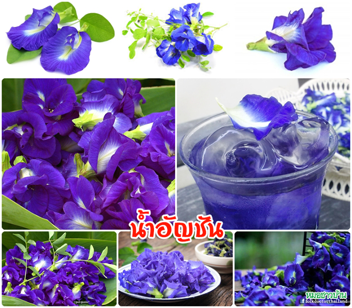 ส่วนประกอบ : ดอกอัญชัน 100 กรัม น้ำเชื่อม 4 ช้อนโต๊ะ น้ำผึ้ง 2 ช้อนโต๊ะ