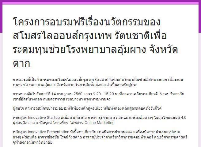 ขอเชิญฟังการอบรมเรื่อง Innovative Startup และ Innovative Presentation เพื่อระดมทุนหาเงินซื้อสิ่งของจำเป็นช่วยโรงพยาบาลอุ้มผาง จังหวัดตาก