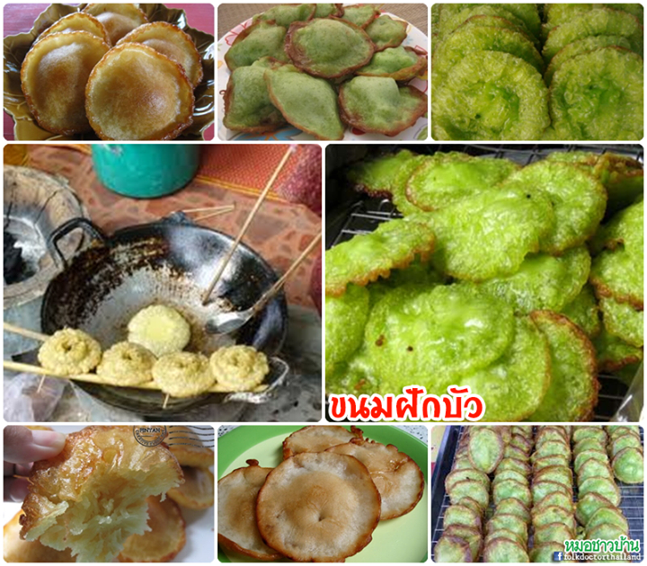 ขนมฝักบัวหรือเรียกอีกชื่อว่าขนมดอกบัว รูปร่างกลม ตรงกลางนูน ตรงขอบจะเกรียมกว่าด้านใน ขอบหยักคล้ายใบบัว เนื้อขนมจะเหนียวนุ่ม ขณะทอดใช้ไม้ปลายแหลมปักยึดขนมไว้ตรงกลางกระทะ หมั่นตักน้ำมันรดขนมให้ทั่วเพื่อให้สุกสม่ำเสมอ ขอบแป้งจะขึ้นมาเป็นสัน ส่วนกลางขนมจะนูนขึ้น ขนมนี้ไม่นิยมทอดให้เหลืองกรอบมาก ให้พอเหลืองเล็กน้อยและขนมนุ่มๆ จะอร่อยกว่ากรอบแข็ง เพราะถ้าทอดเหลืองมากขนมจะแข็ง ไม่อร่อยเท่าที่ควร