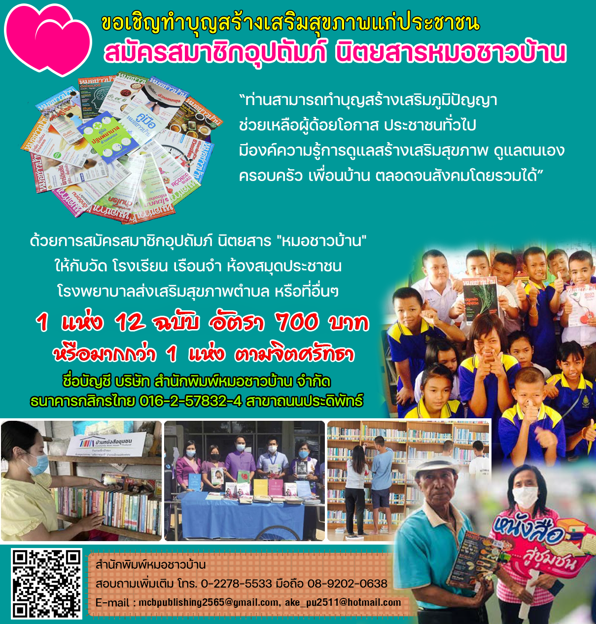 ท่านสามารถช่วยเหลือผู้ด้อยโอกาสและประชาชนให้มีความรู้ ความเข้าใจในการดูแลสร้างเสริมสุขภาพ ดูแลตนเอง ครอบครัวเพื่อนบ้าน ตลอดจนสังคมโดยรวมได้ ด้วยการสมัครสมาชิกอุปถัมภ์ นิตยสาร "หมอชาวบ้าน" ให้กับวัด โรงเรียน เรือนจำ ห้องสมุดประชาชน โรงพยาบาลส่งเสริมสุขภาพตำบล หรือที่อื่นๆ