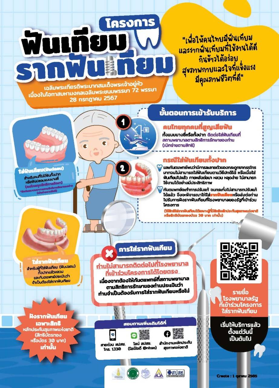 โครงการฟันเทียม รากฟันเทียมเฉลิมพระเกียรติพระบาทสมเด็จพระเจ้าอยู่หัว เนื่องในโอกาสมหามงคลเฉลิมพระชนมพรรษ 72 พรรษา 28 กรกฎาคม 2567 เพื่อให้คนไทยมีฟันเทียม และรากฟันเทียมที่ใช้งานได้ดี กินข้าวได้อร่อย สุขภาพกายและใจที่แข็งแรง มีคุณภาพชีวิตที่ดี สิทธิมีจำนวนจำกัด