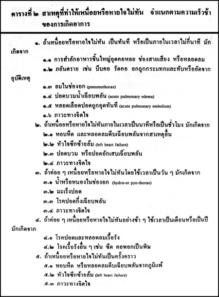 4.6 รักษาสาเหตุ สาเหตุของอาการหายใจไม่ทันหรือหอบ เหนื่อย (จำแนกตามความเร็วช้าของการเกิดอาการ) ได้แสดงไว้ในตารางที่ 2 สาเหตุส่วนใหญ่จำเป็นจะต้องได้รับการรักษาที่โรงพยาบาลนอกจากสาเหตุ เช่น