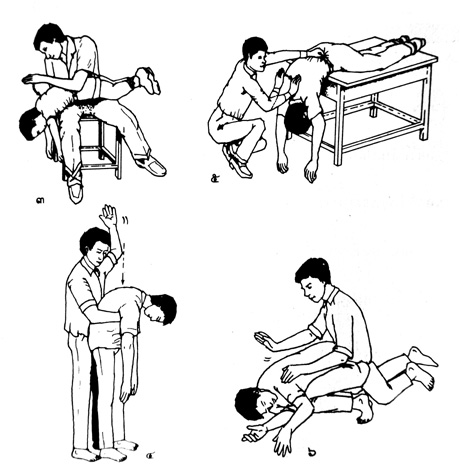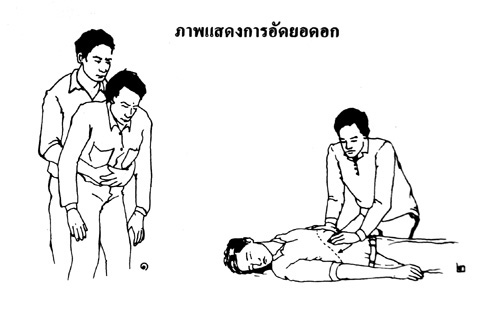 ถ้าผู้ป่วยยังพอรู้ตัวอยู่ เข้าทางด้านหลัง ใช้มือโอบรอบเอว ให้กำปั้นของมือหนึ่ง ซุกเข้าไปในท้องระหว่างสะดือกับลิ้นปี่ แล้วใช้มืออีกข้างหนึ่งกุมกำปั้นนั้นไว้ แล้วออกแรงรัดและยกตัวผู้ป่วยขึ้นทันที เพื่อให้กำปั้นนั้นถูกอัดเข้าไปในยอดอกและยกขึ้น (รูปที่ 1)ถ้าผู้ป่วยไม่รู้สึกตัว อาจให้อยู่ในท่านอนหงาย แล้วใช้ฝ่ามือทั้งสองดันบริเวณหน้าท้องด้านบนเข้าและขึ้นข้างบนทันที เพื่อให้เกิดแรงดันกะบังลมขึ้นไปในช่องอก ผลักดันให้ก้อนที่ปิดกั้นทางเดินหายใจหลุดออก (รูปที่ 2) |